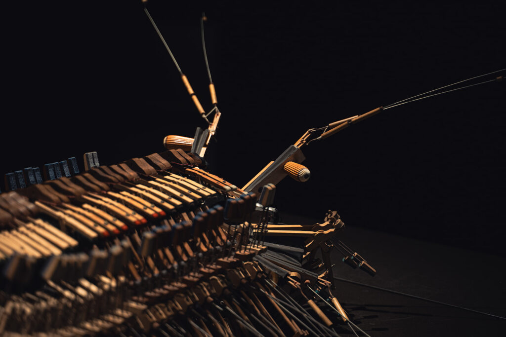 La construction de ce myriapode, familièrement appelé mille-pattes, a nécessité l’utilisation de 3 pianos, 2 pianos à queue, 1 piano pneumatique, 1 mandoline chinoise, 1 accordéon et 2 grelots à clochettes. Le processus de réalisation est rendu visible par la projection d’un film.
